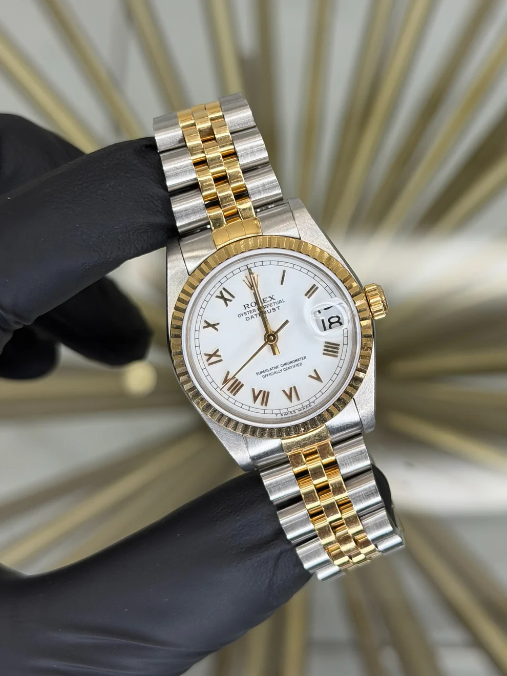 This elegant Rolex Datejust 31, reference number 68273, is a stunning example of luxury watchmaking. Combining stainless steel and yellow gold, it flaunts a classic fluted bezel and a white Roman dial that provides a touch of sophistication. The Jubilee bracelet adds to its timeless appeal, making it a versatile accessory suited for any event. The 31mm case size strikes the perfect balance between subtlety and style, embodying Rolex’s commitment to excellence.