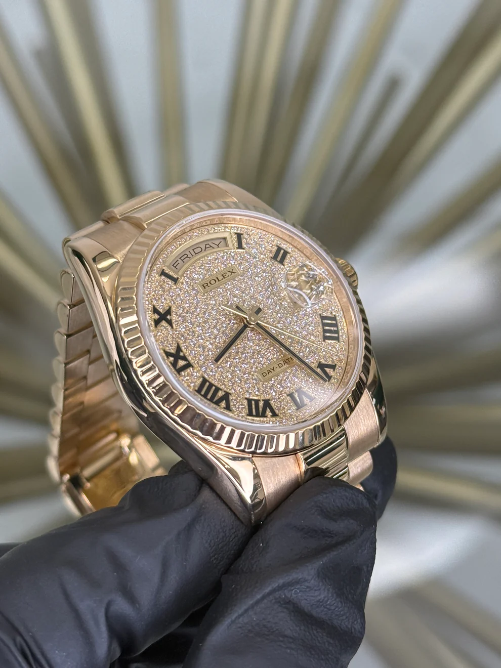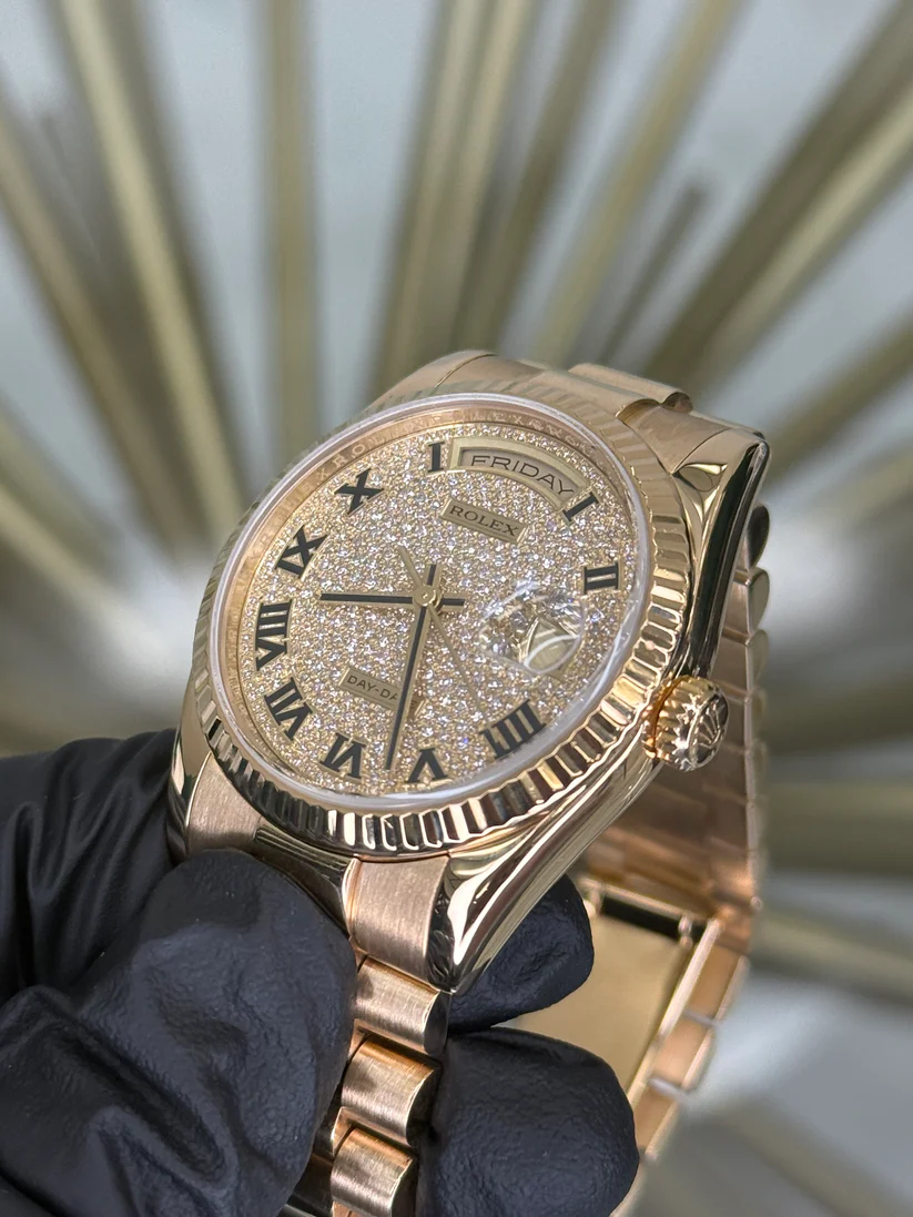 This exquisite Rolex Day-Date 36, reference number 118238, embodies luxury and prestige. Crafted in yellow gold, it features a stunning pave dial and the distinguished fluted bezel. The President bracelet adds an unrivaled elegance to the watch, enhancing its 36mm case. This pre-owned masterpiece is a testament to Rolex’s timeless craftsmanship and sophistication.